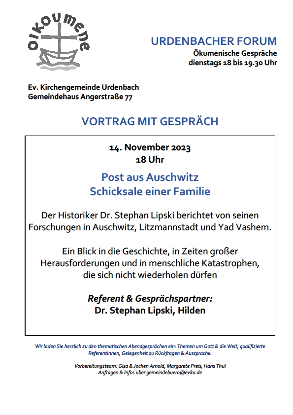 Der Historiker Dr. Stephan Lipski berichtet von seinen Forschungen in Auschwitz, Litzmannstadt und Yad Vashem. Ein Blick in die Geschichte, in Zeiten großer Herausforderungen und in menschliche Katastrophen, die sich nicht wiederholen dürfen.