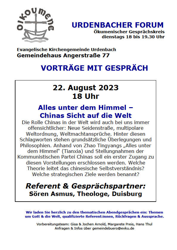 Die Rolle Chinas in der Welt wird auch bei uns immer offensichtlicher: Neue Seidenstraße, multipolare Weltordnung, Weltmachtansprüche. Hinter diesen Schlagworten stehen grundsätzliche Überlegungen und Philosophien. Anhand von Zhao Tingyangs „Alles unter dem Himmel“ (Tianxia) und Stellungnahmen der Kommunistischen Partei Chinas soll ein erster Zugang zu diesen Vorstellungen erschlossen werden. Welche Theorie leitet das chinesische Selbstverständnis? Welche strategischen Ziele werden benannt?