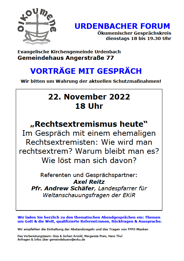 Urdenbacher Forum am 22.11.2022 ab 18 Uhr „Rechtsextremismus heute“: Im Gespräch mit einem ehemaligen Rechtsextremisten: Wie wird man rechtsextrem? Warum bleibt man es? Wie löst man sich davon?