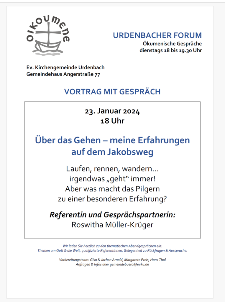 Urdenbacher Forum am 23.01.2024 ab 18 Uhr Über das Gehen – meine Erfahrungen auf dem JakobswegLaufen, rennen, wandern… irgendwas „geht“ immer!Aber was macht das Pilgern zu einer besonderen Erfahrung? Referentin und Gesprächspartnerin:Roswitha Müller-Krüger