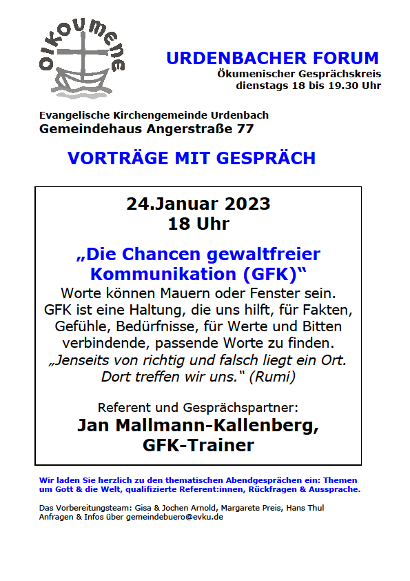 Urdenbacher Forum am 24.01.2023 um 18 Uhr „Die Chancen gewaltfreier Kommunikation (GFK)“ – Worte können Mauern oder Fenster sein. GFK ist eine Haltung, die uns hilft, für Fakten, Gefühle, Bedürfnisse, für Werte und Bitten verbindende, passende Worte zu finden.