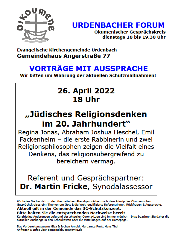 Urdenbacher Forum am 26.04.2022 um 18 Uhr: Jüdisches Religionsdenken im 20. Jahrhundert