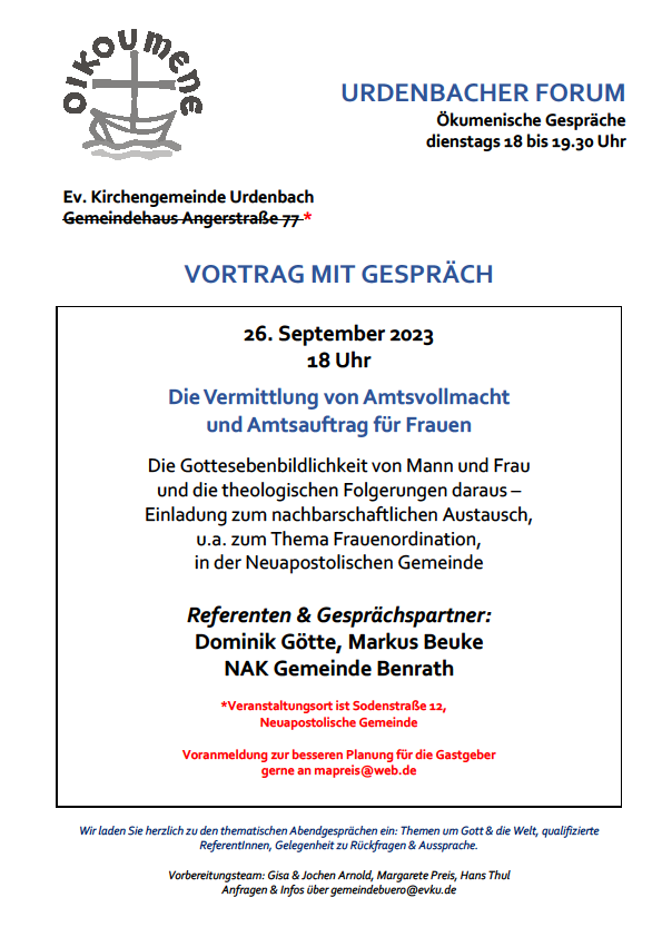 Die Gottesebenbildlichkeit von Mann und Frau und die theologischen Folgerungen daraus – Einladung zum nachbarschaftlichen Austausch, u.a. zum Thema Frauenordination, in der Neuapostolischen Gemeinde