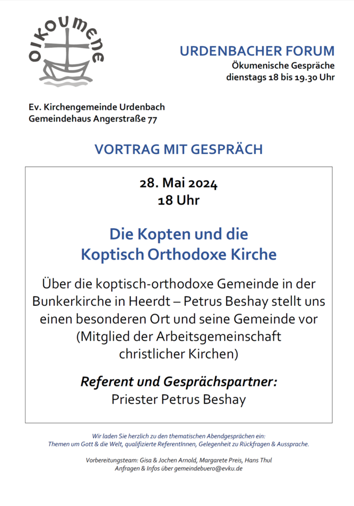 Urdenbacher Forum am 28.05.2024 um 18 Uhr Die Kopten und die Koptisch Orthodoxe Kirche Über die koptisch-orthodoxe Gemeinde in der Bunkerkirche in Heerdt. Petrus Beshay stellt uns einen besonderen Ort und seine Gemeinde vor (Mitglied der Arbeitsgemeinschaft christlicher Kirchen).