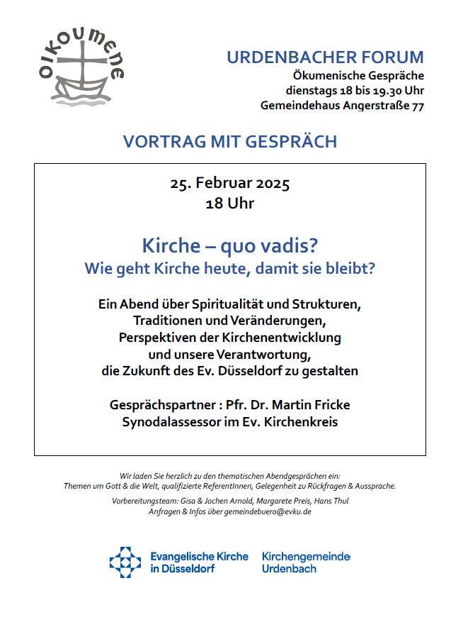 Urdenbacher Forum Dienstag, 25.02.2025 Herzliche Einladung zum Urdenbacher Forum am Dienstag, den 25.02. um 18 Uhr im Großen Saal des Gemeindehauses Angerstraße 77. Als Referent zu Gast ist Synodalassessor Pfr. Dr. Martin Fricke. Thema „Kirche – quo vadis?“