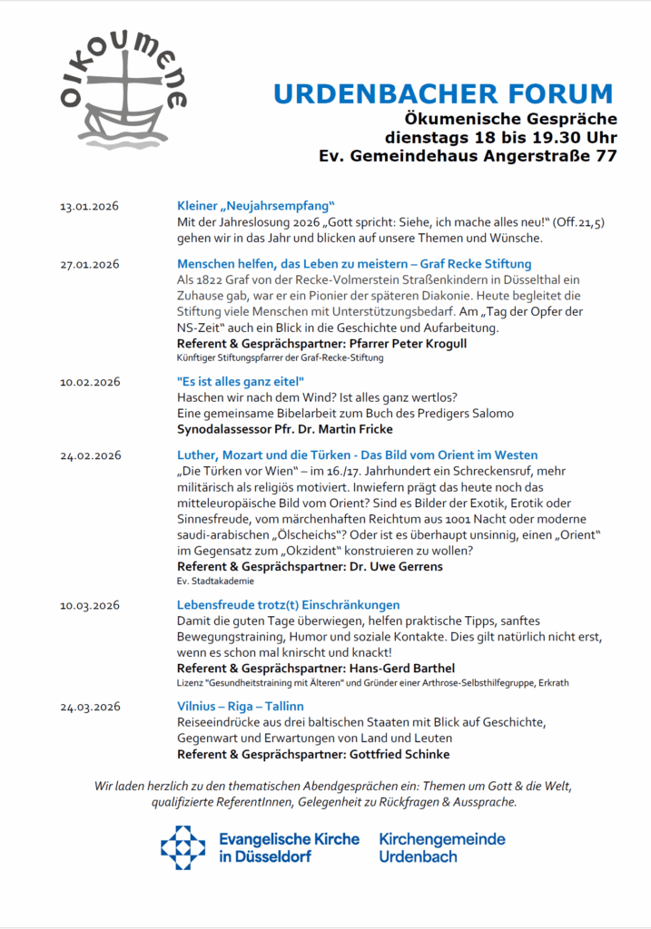 Urdenbacher Forum: Erstes Quartal 2026 Wir laden herzlich zu den thematischen Abendgesprächen ein: Themen um Gott & die Welt, qualifizierte ReferentInnen, Gelegenheit zu Rückfragen & Aussprache.