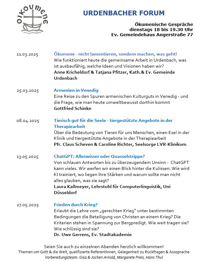 Urdenbacher Forum: Übersicht März – Mai 2025